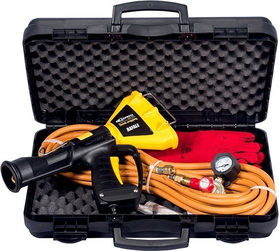 Rafale zmršťovacia pištoľ 40 kW je zmršťovacia tepelná pištoľ. Vďaka piezoelektrickému zapaľovaniu a rýchlemu a otočnému pripojeniu je táto zmršťovacia pištoľ výkonným a efektívnym nástrojom. Umožňuje zmršťovanie polyetylénových poťahov všetkých hrúbok v dielni alebo na pracovisku na zväzovanie obalov, dielov alebo strojov všetkých tvarov a veľkostí.