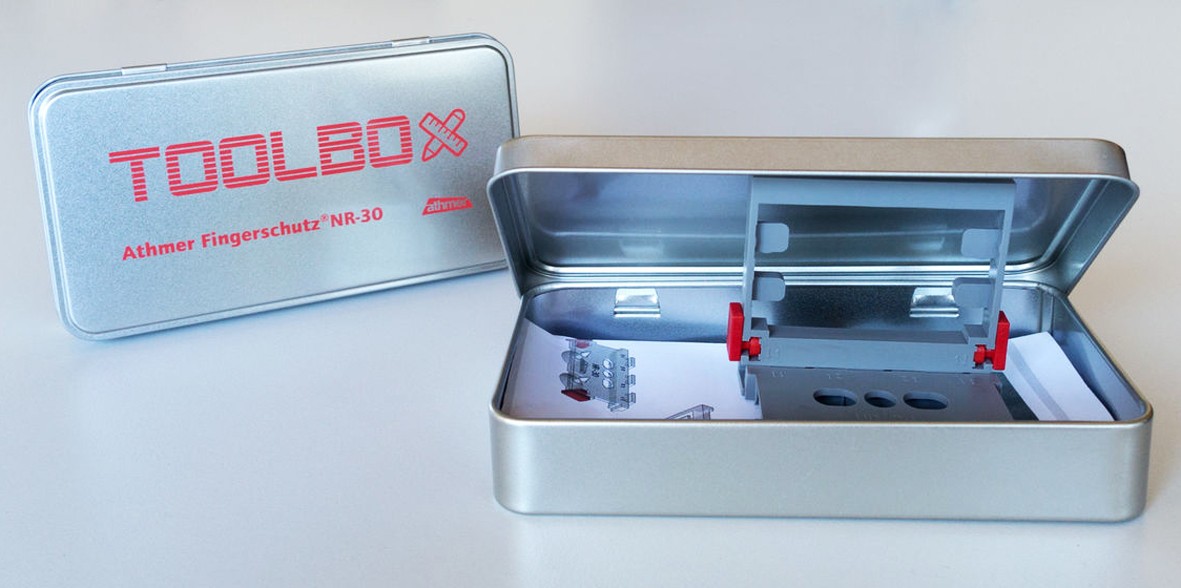 Šablóna pre rýchlu a bezpečnú montáž ochrany prstov NR-30 vrátane multi vrtáka na vŕtanie do oceľových zárubní Viac o produkte