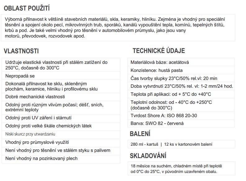Pružný silikónový tmel na báze acetátu, ktorý sa používa na spájanie spojov pri vyšších teplotách do + 250 ° C, krátkodobo do 300 ° C. Výborná priľnavosť k väčšine stavebných materiálov, skla,… Viac o produkte