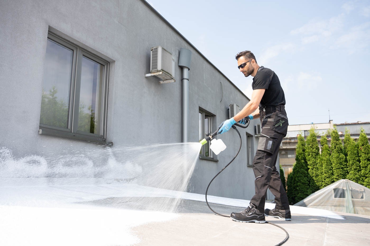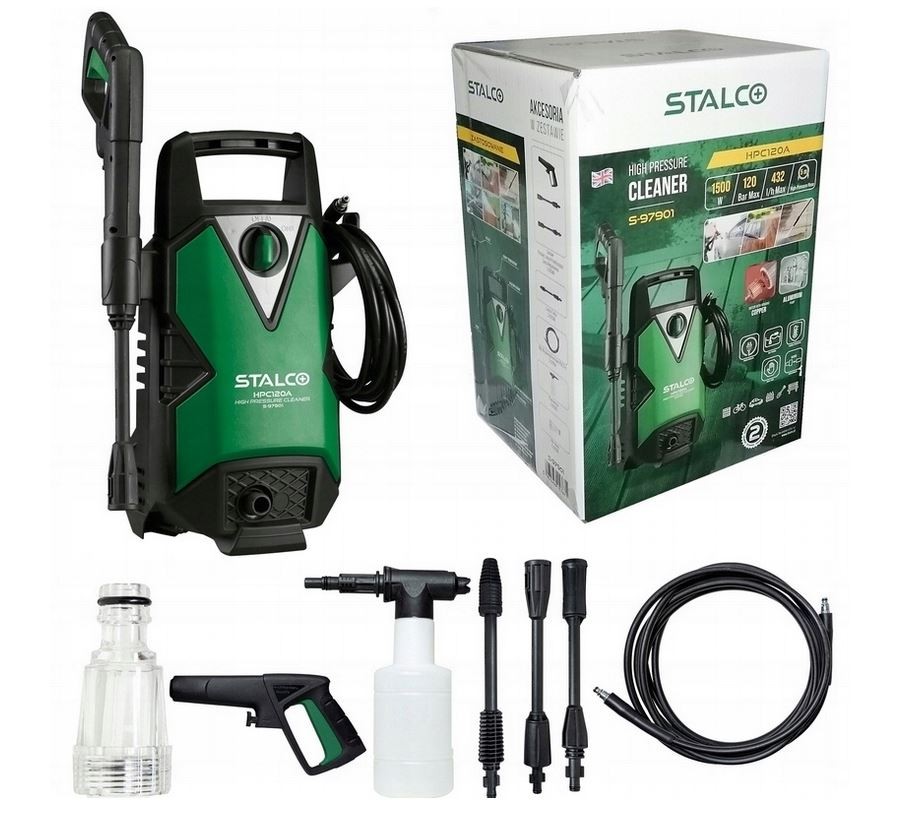 Príslušenstvo: pištoľ, predlžovacia rúrka, regulovateľná tryska, vysokotlaková hadica PVC 5 m, penovacia tryska s nádobkou, filter vody